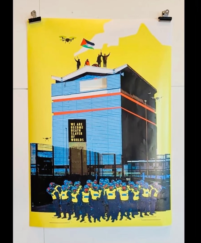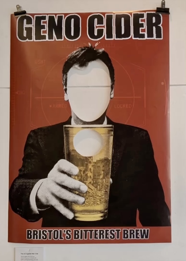All artworks were approved by both M Shed and Bristol City Council before the exhibition launch. Despite this, shortly after opening, the exhibition was temporarily closed while certain artworks were reviewed by Bristol City Council. Some pieces now feature redactions where references to Elbit and BAE Systems were removed. The works have since been reinstated with these adjustments. Throughout this process, we have worked closely with our cultural colleagues at M Shed, Bristol City Council, and in particular The Art Against War Club, who were significantly affected.